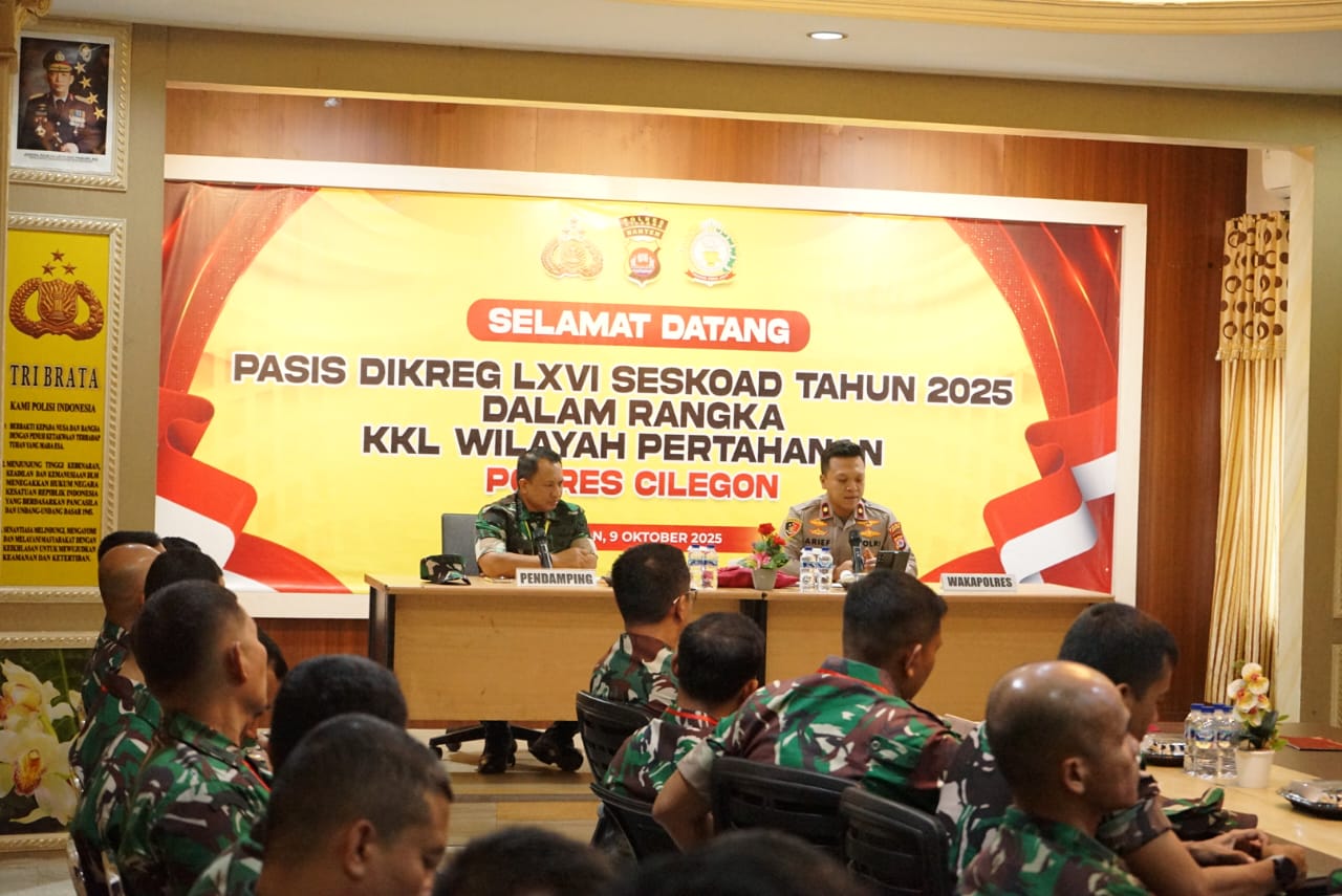 Cilegon – Polres Cilegon Polda Banten menerima kunjungan kegiatan Kuliah Kerja Lapangan (KKL) Perwira Siswa (Pasis) Pendidikan Reguler (Dikreg) LXVI Sekolah Staf dan Komando Angkatan Darat (Seskoad) Tahun 2025, Kegiatan yang berlangsung di Rupatama Polres Cilegon ini menjadi wadah penting untuk memperkuat sinergitas antara TNI dan Polri dalam mendukung program strategis nasional. Kamis (9/10/2025).