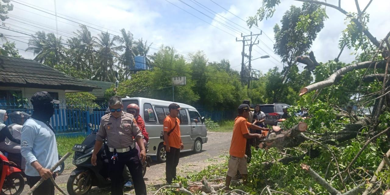 Polsek Anyar Polrea Cilegon Polda Banten Evakuasi Pohon Tumbang yang diakibatkan Oleh angin kencang, Minggu (26/10).