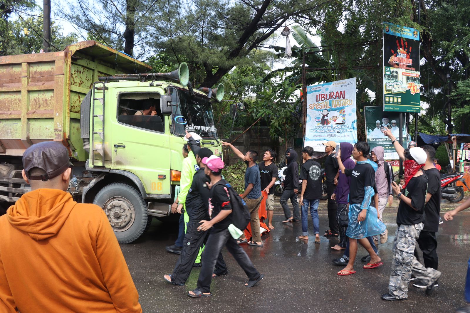 massa sempat memblokade akses jalan di sekitar lokasi aksi. Kasat Intel Polres Cilegon bersama Kasat Intel Polresta Serang Kota kemudian melakukan penggalangan terhadap massa dan salah satu tokoh aksi, Muksinin, untuk membuka jalan kembali demi menjaga kelancaran arus lalu lintas dan menghindari gangguan yang lebih luas kepada masyarakat.