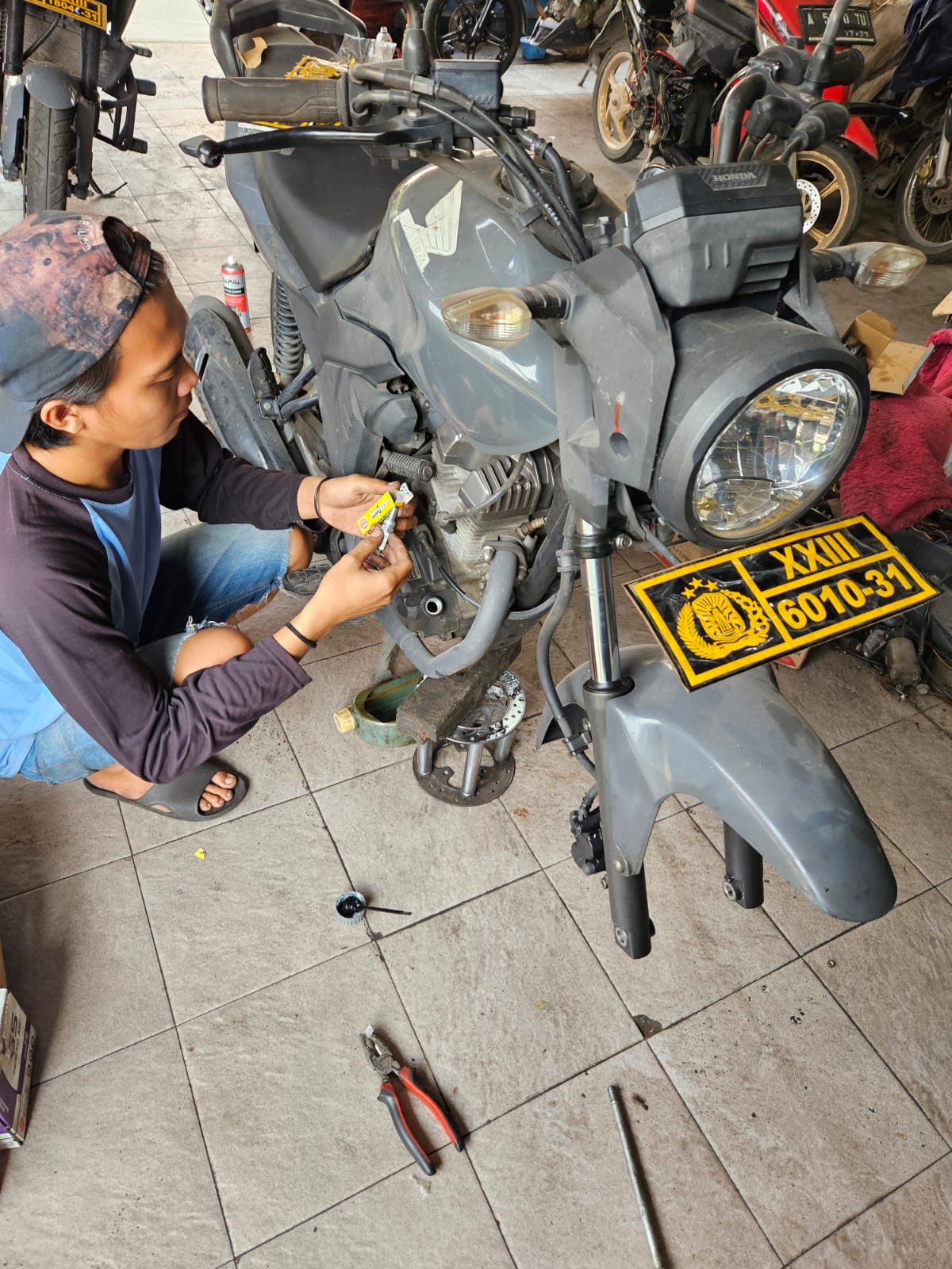 Cilegon Polres cilegon Polda Banten Staf Logistik melakukan pengecekan perawatan kendaraan dinas roda 2 yang sedang di lakukan perawatan.