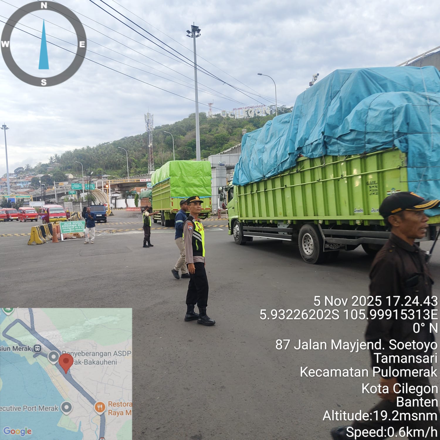 Personil KSKP Merak Polres Cilegon Polda Banten Laksanakan Pengaturan Kendaraan di Pelabuhan Merak