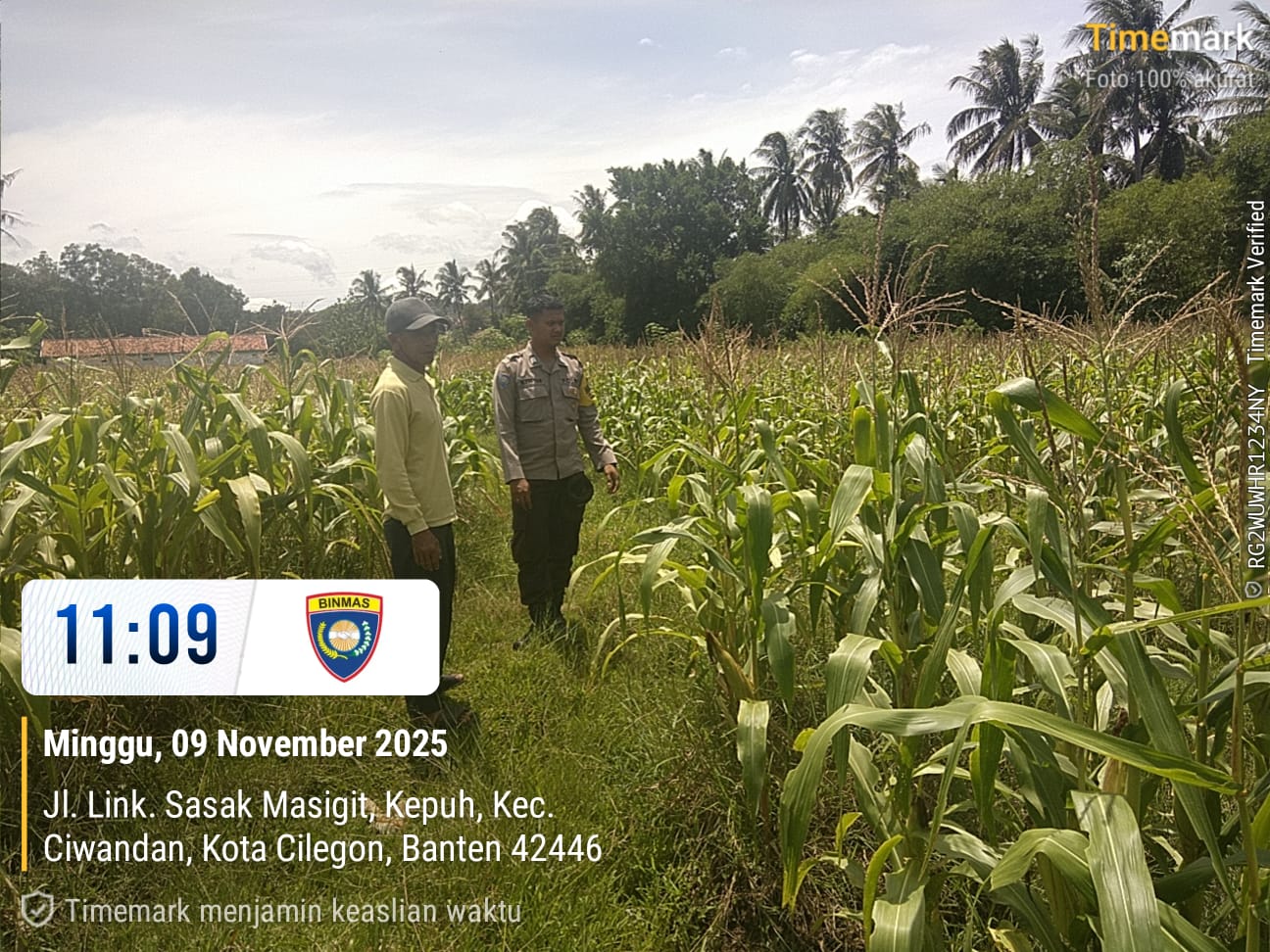 Bhabinkamtibmas Polsek Ciwandan Polres Cilegon Polda Banten, memantau Lahan Dan Tanaman jagung Kelompok Tani Lingkungan Binaan.