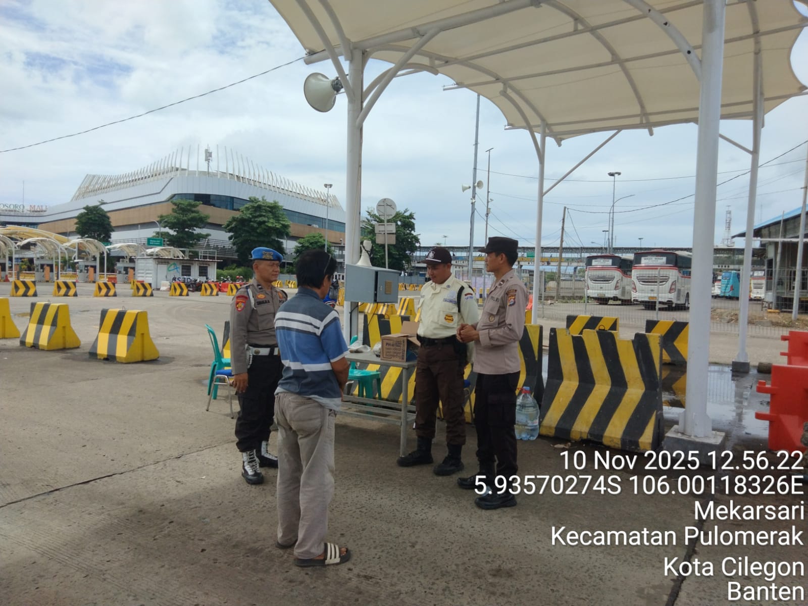 Cilegon - Personel Polsek Kskp Merak Polres Cilegon Polda Banten melaksanakan sambang dan patroli kawasan pelabuhan merak dalam rangka menjaga Harkamtibmas di Kawasan Pelabuhan Merak, Senin (10/11/2025).