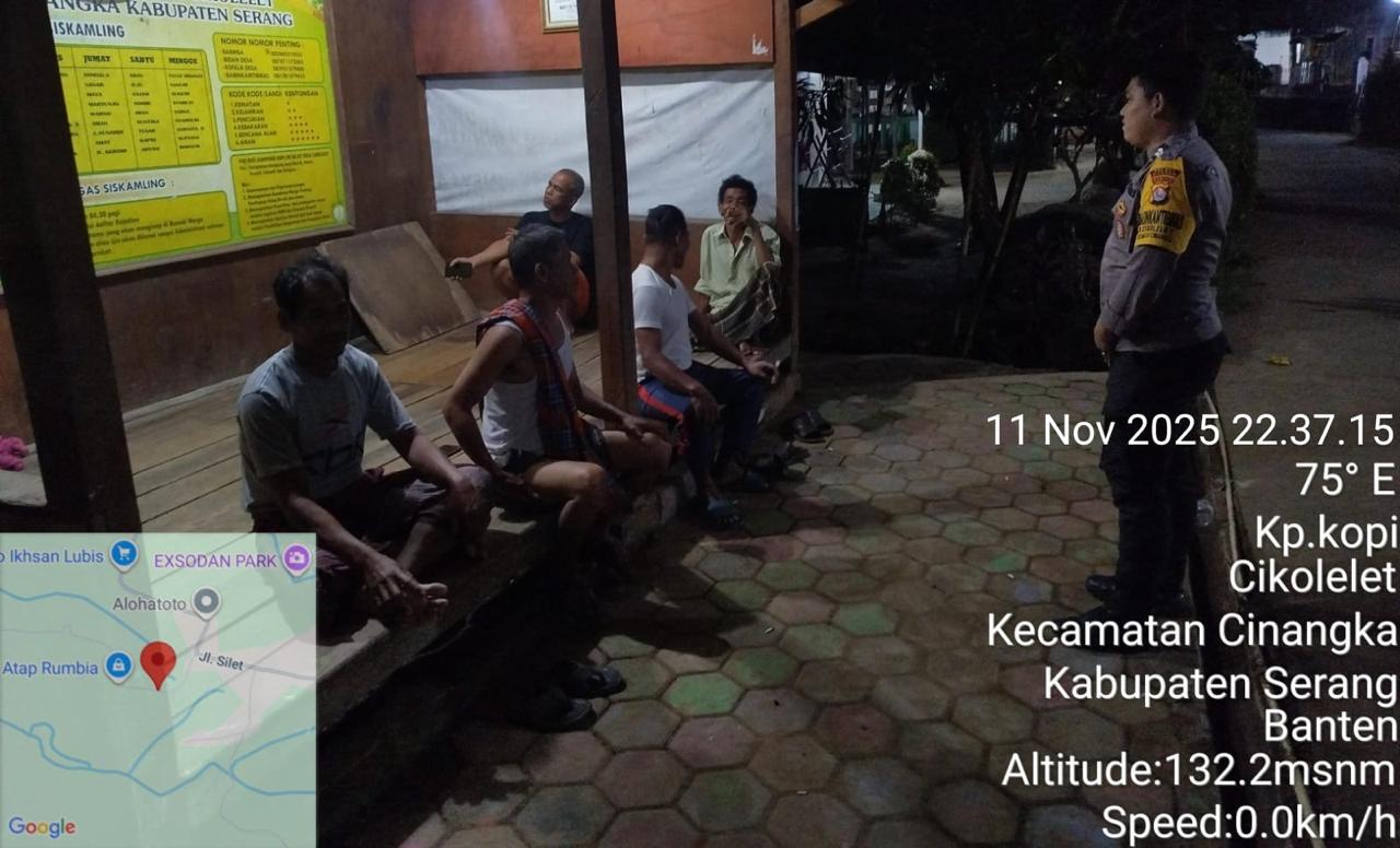 *Polres Cilegon* || Personil Bhabinkamtibmas Polsek Cinangka melaksanakan Program Komandan Wish Kapolda Banten RONDA SATKAMLING menyampaikan komunikasi dengan Petugas Siskamling agar berperan aktif dalam menciptakan Harkamtibmas yang aman dan Kondusif, Rabu (12/11/2025).