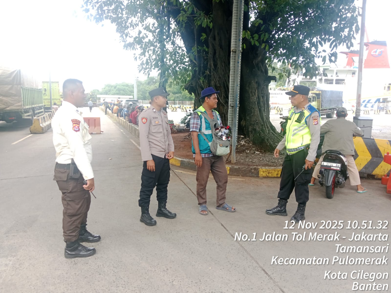 Cilegon - Personel Polsek Kskp Merak Polres Cilegon Polda Banten melaksanakan sambang dan patroli kawasan pelabuhan merak dalam rangka menjaga Harkamtibmas di Kawasan Pelabuhan Merak, Rabu (12/11/2025).