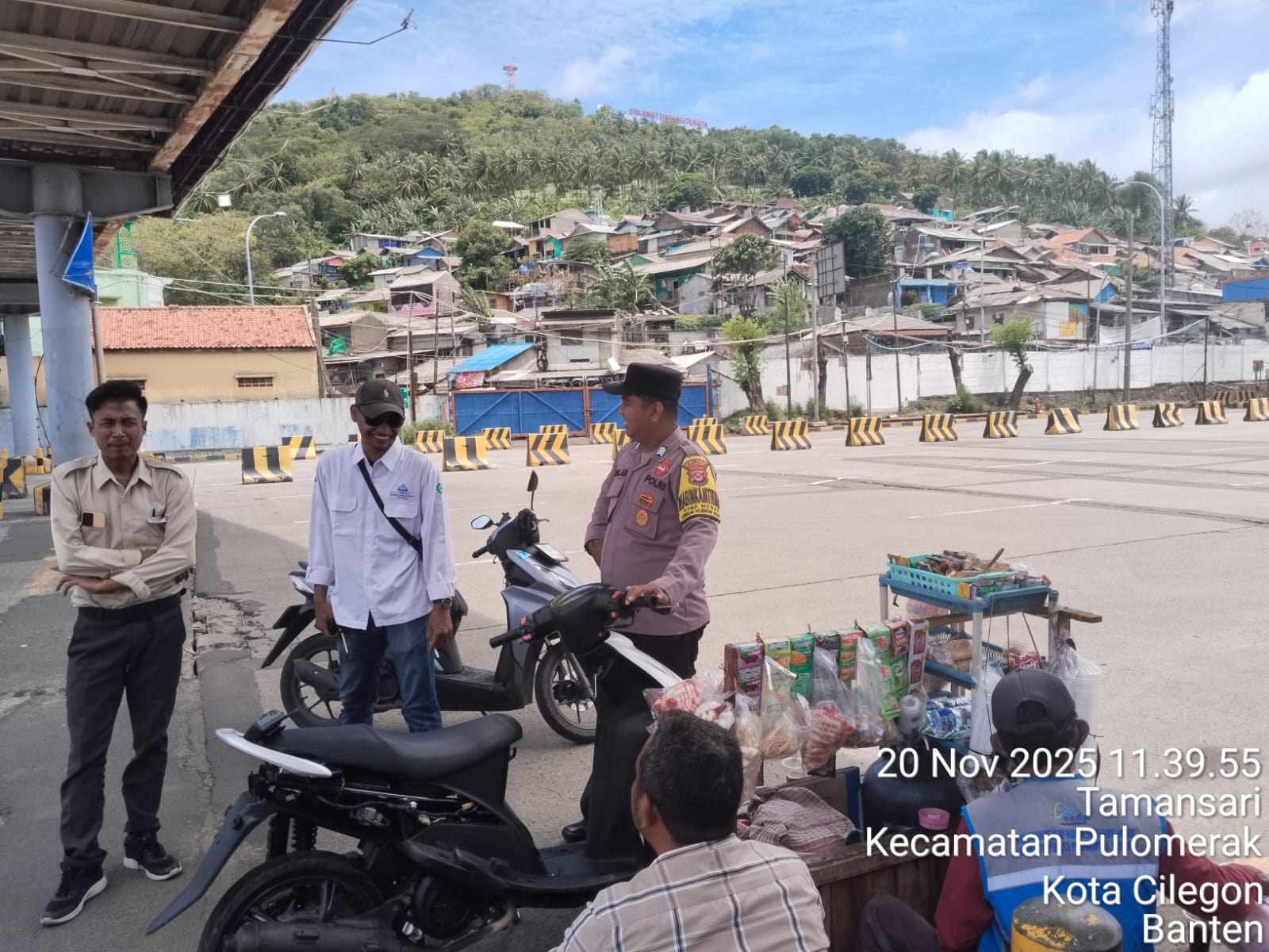 Cilegon - Personel Polsek Kskp Merak Polres Cilegon Polda Banten melaksanakan sambang dan patroli kawasan pelabuhan merak dalam rangka menjaga Harkamtibmas di Kawasan Pelabuhan Merak, Kamis (20/11/2025).