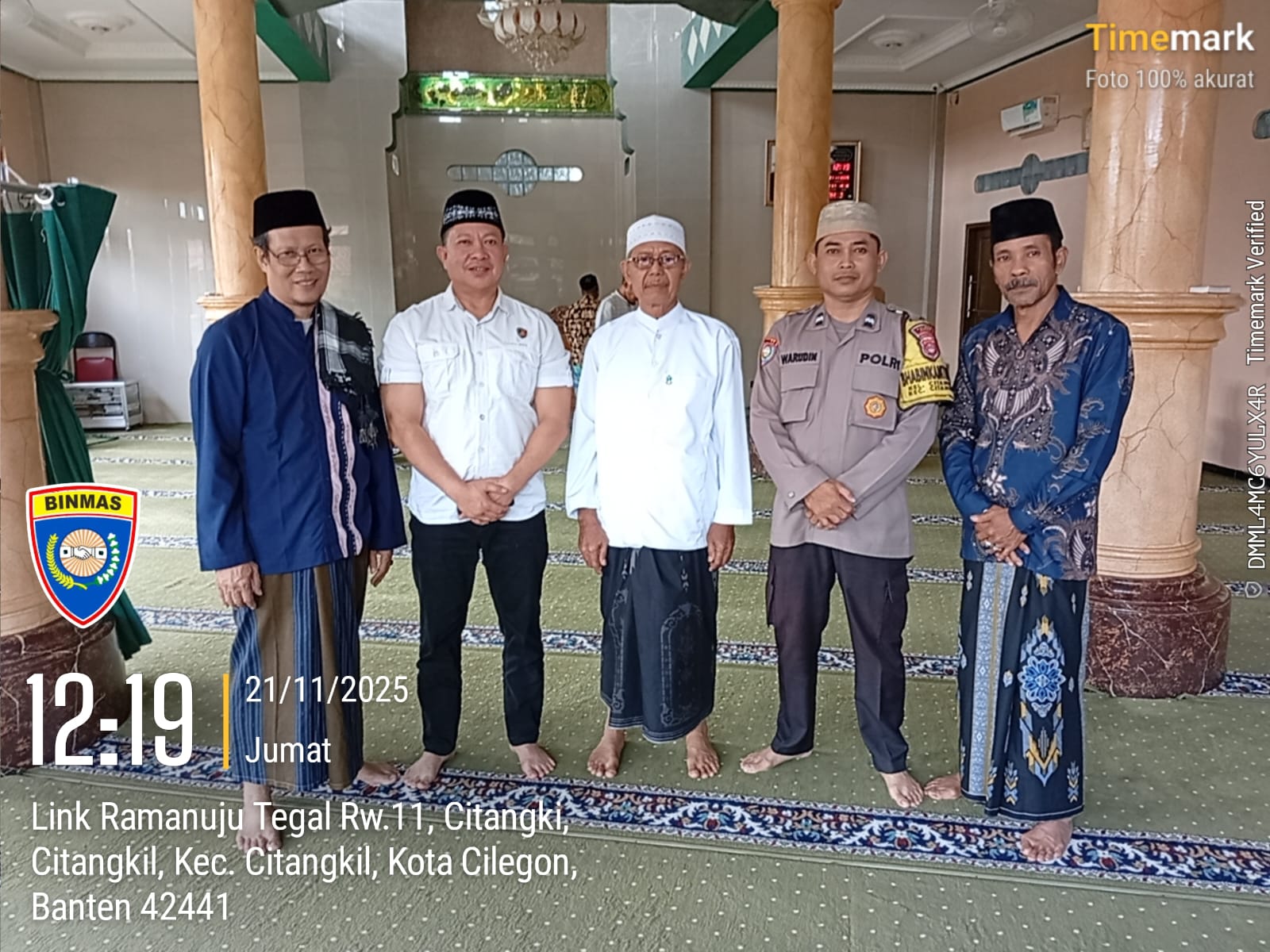 Cilegon - Bhabinkamtibmas Polsek Ciwandan Polres Cilegon Polda Banten Selesai melaksanakan Sholat secara berjama’ah dan Sampaikan Himbauan-himbauan Kamtibmas Kepada Masyarakat Jama'ah Yang ada Dimasjid, Jum'at (21/11/2025).