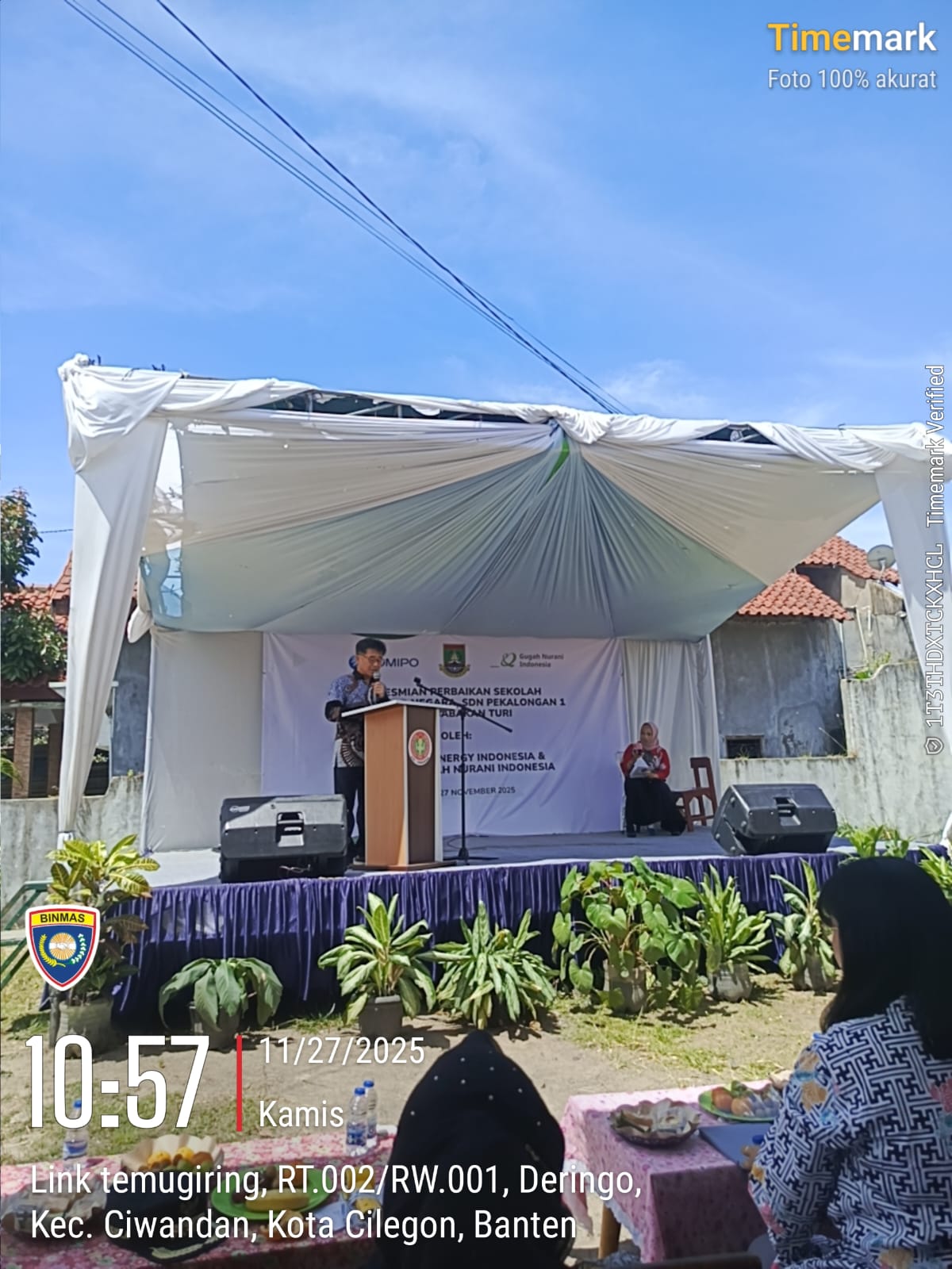 Cilegon - Waka Polsek Ciwandan AKP Uup M. Ma'ruf dan Bhabinkamtibmas Kelurahan Banjarnegara AIPTU Jamaludin menghadiri peresmian perbaikan tiga sekolah dasar—SDN Banjarnegara, SDN Pekalongan 1, dan SDN Babakan Turi—di Halaman SDN Banjarnegara, Link Temugiring, Kel. Banjarnegara, Kec. Ciwandan, Kota Cilegon, Kamis (27/11/2025).