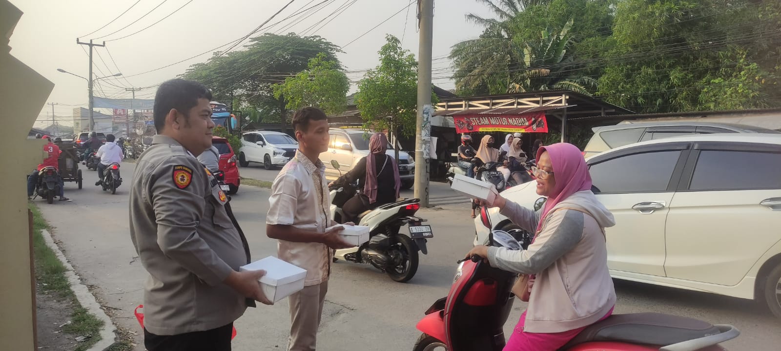 Kapolres Cilegon AKBP Martua Raja Taripar Laut Silitonga Melalui Kapolsek Cibeber Polres Cilegon Polda Banten  AKP Atep Mulyana menyampaikan Pembagian nasi kotak kepada masyarakat yang melintas depan Mako Polsek Cibeber .