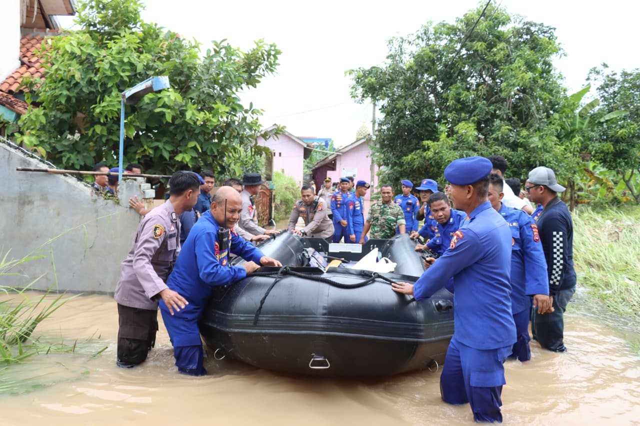 Usai meninjau dapur umum, Kapolda Banten melanjutkan pengecekan ke lokasi banjir di Lingkungan Sambirata RT 005/003, Kelurahan Cibeber, Kecamatan Cibeber. Di lokasi tersebut, Kapolda melihat langsung kondisi pemukiman warga yang terdampak banjir sekaligus menyerahkan bantuan makanan kepada masyarakat sebagai bentuk empati dan dukungan moril.