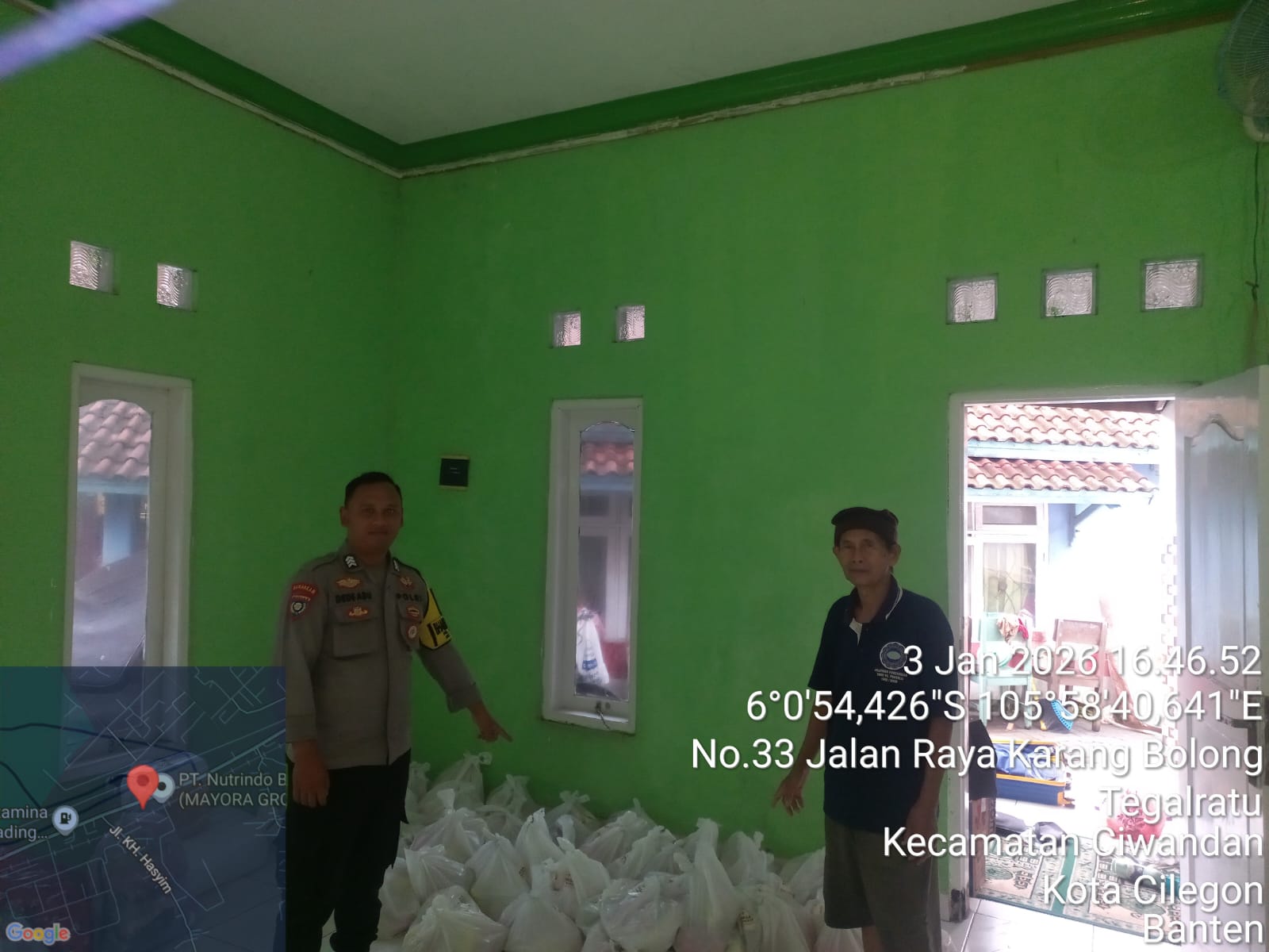 Kapolsek Ciwandan, Kasat Binmas, Kasi Dokkes, dan Anggota Baglog Logistik turut serta dalam aksi bantuan. Warga yang terdampak sebagian mengungsi di Musholla setempat.