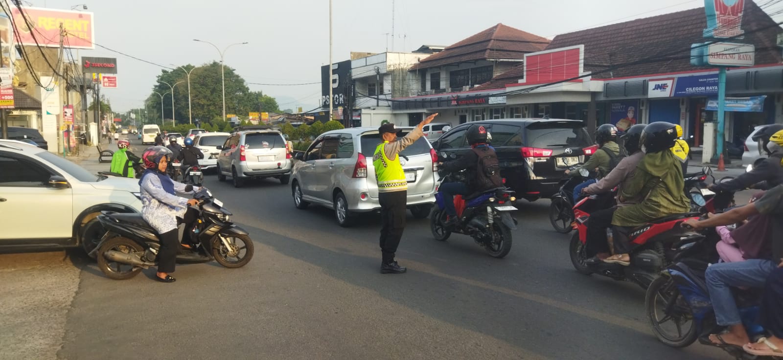 Personel Polsek Cilegon melaksanakan kegiatan strong point pagi dengan melakukan pengaturan arus lalu
