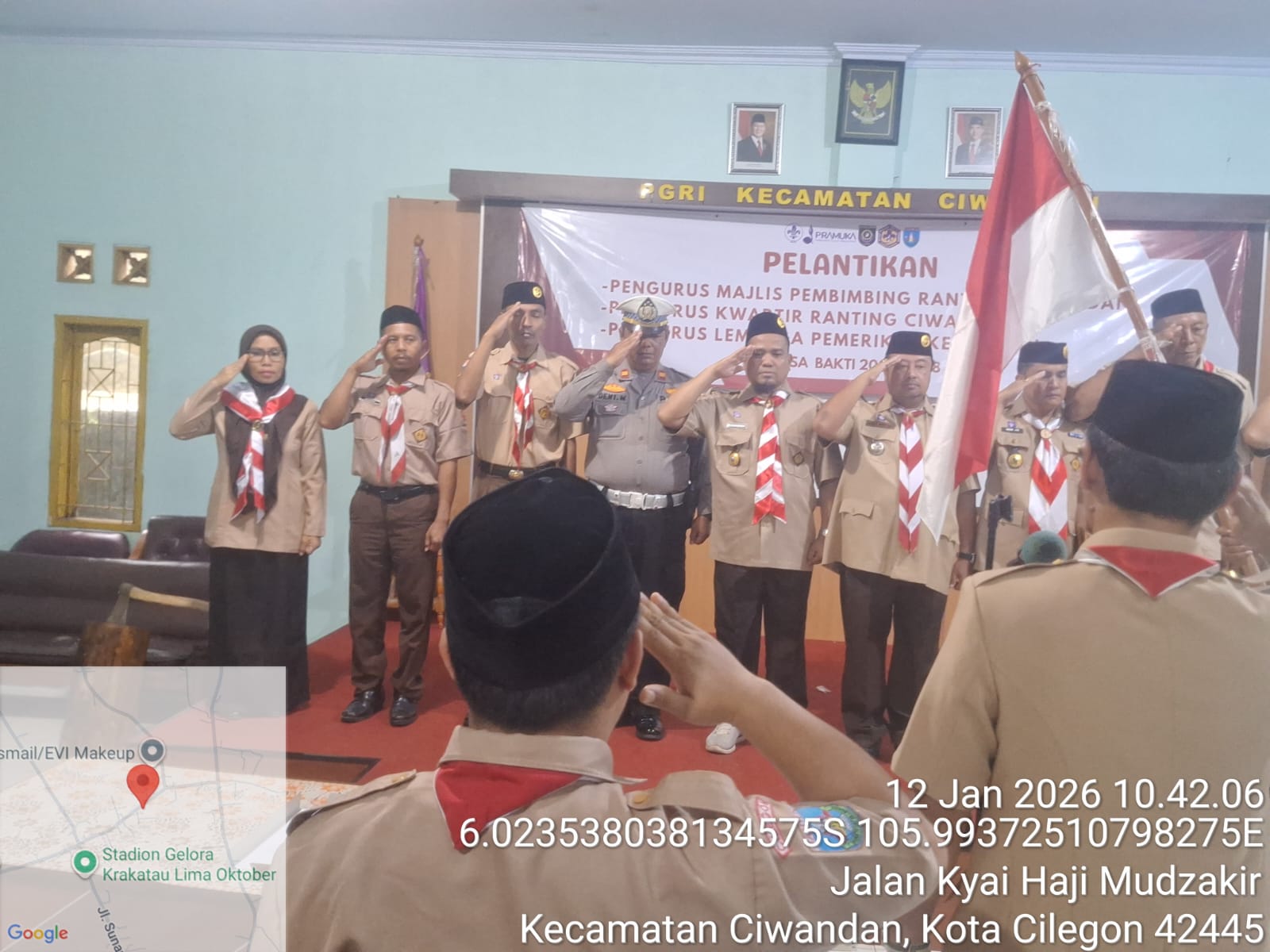 Cilegon - Polres Cilegon melalui Polsek Ciwandan menghadiri pelantikan pengurus Majlis Pembimbing Ranting Ciwandan, Pengurus Kwartir Ranting Ciwandan, dan Pengurus Lembaga Keuangan Masa Bakti 2025-2026 di Gedung PGRI Kecamatan Ciwandan. Senin (12/01/2026).
