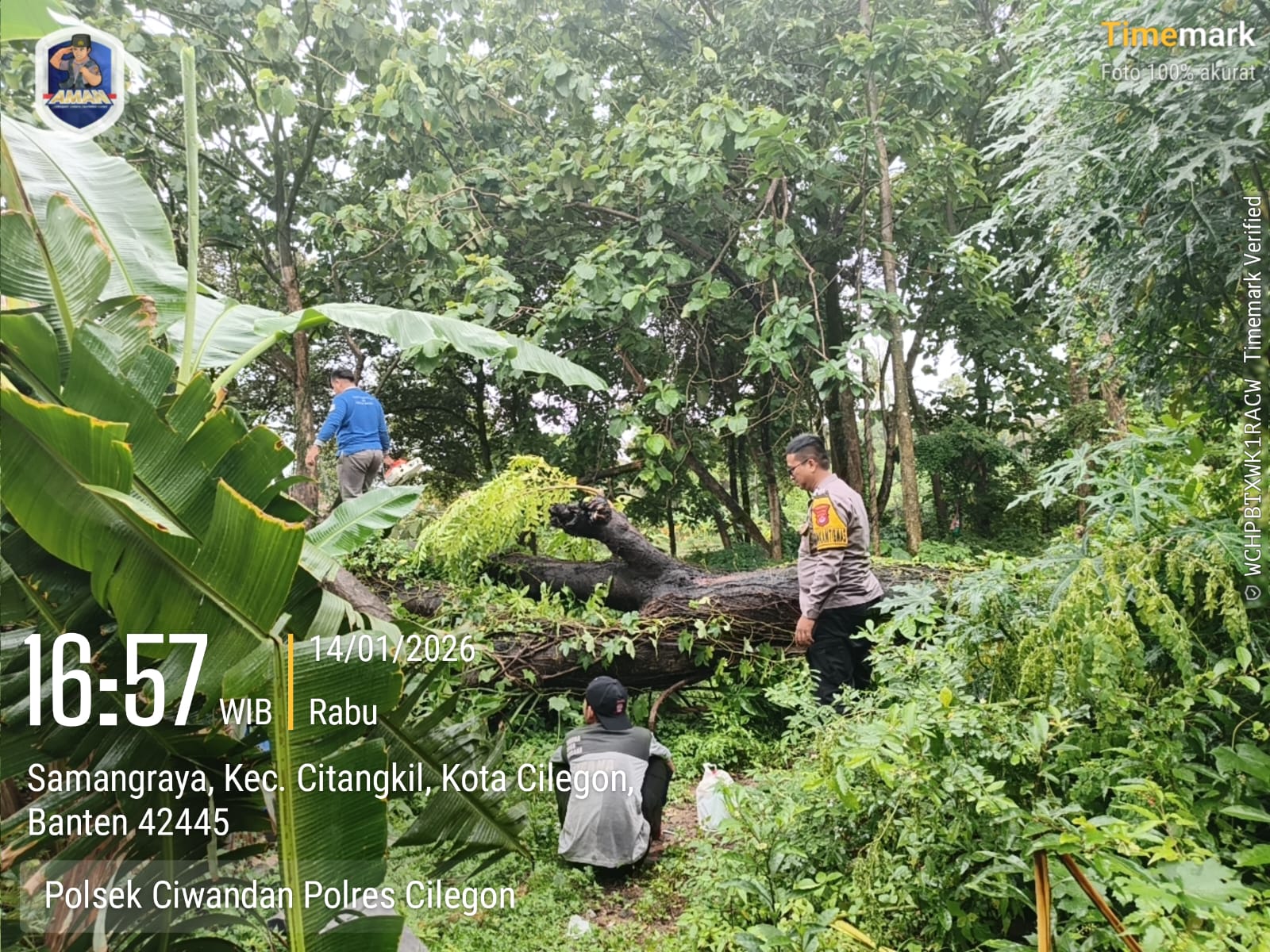 Cilegon - Bhabinkamtibmas Kelurahan Samangraya BRIPKA Marisco bersama Tagana Kota Cilegon dan perangkat RW dan RT, membantu membersihkan area rumah Sdri. IIN yang tertimpa pohon tumbang di Link. Kubang Welut Rt 06/04 Kel. Samangraya. Kamis (15/01/2026).