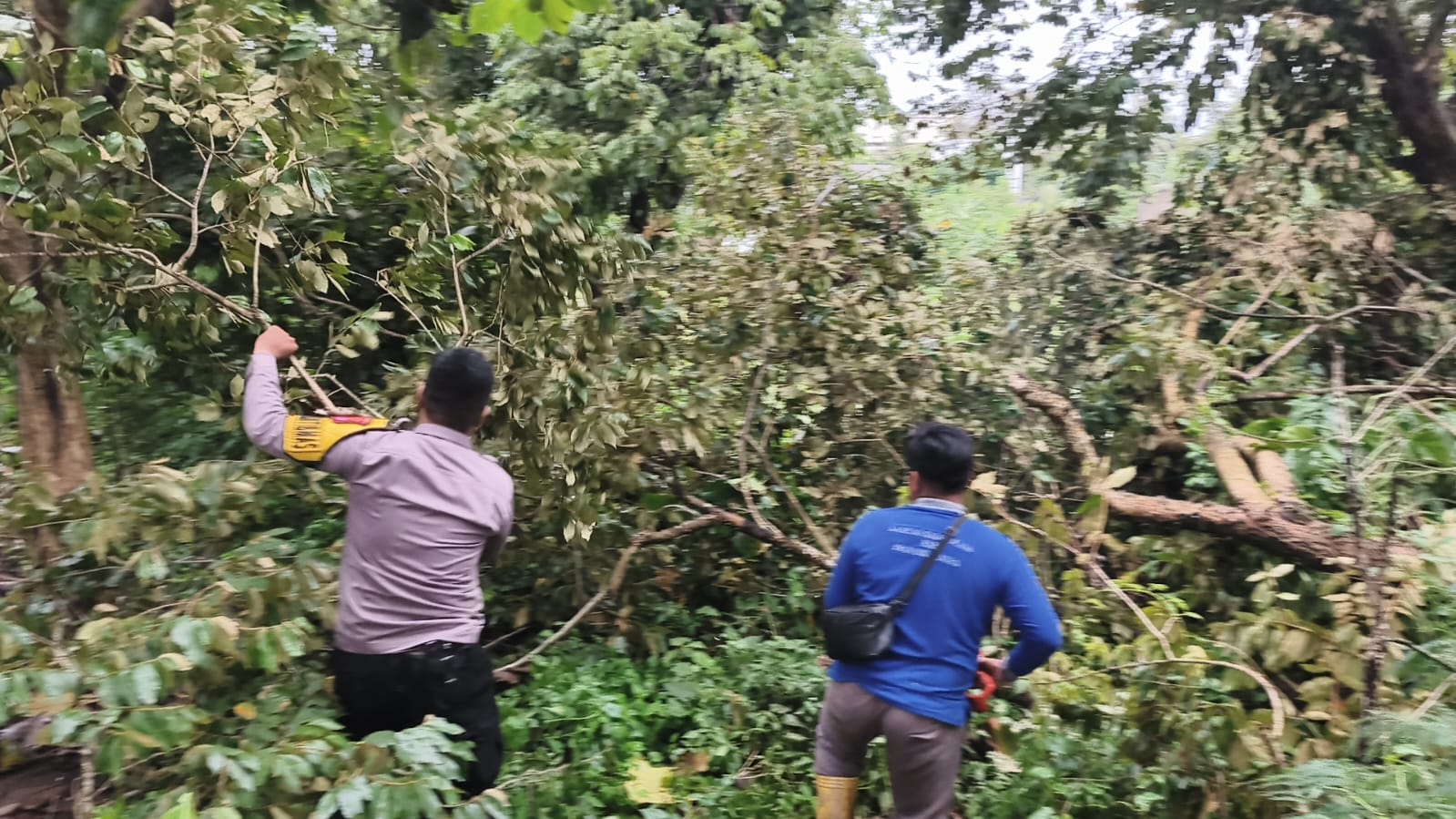 Pohon tumbang lain juga menutupi jalan pemukiman sekitar 20 meter dari rumah Sdri. IIN. Petugas berhasil membersihkan area tersebut, situasi aman dan tertib.