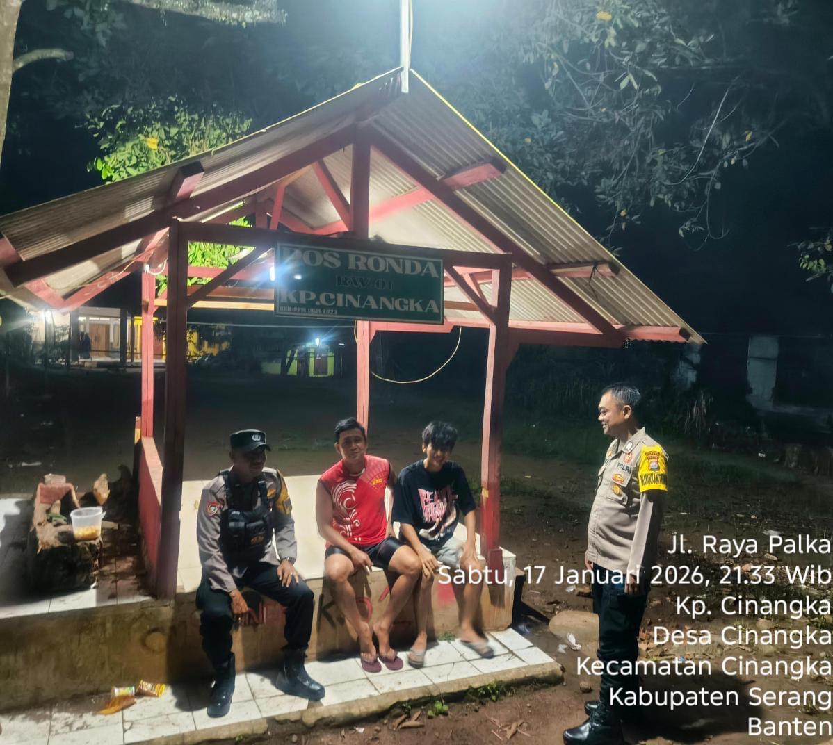 *Polres Cilegon* || Personel Bhabinkamtibmas Polsek Cinangka melaksanakan Program Komandan Wish Kapolda Banten RONDA SATKAMLING menyampaikan komunikasi dengan Petugas Siskamling agar berperan aktif dalam menciptakan Harkamtibmas yang aman dan Kondusif, Minggu (18/01/2026).