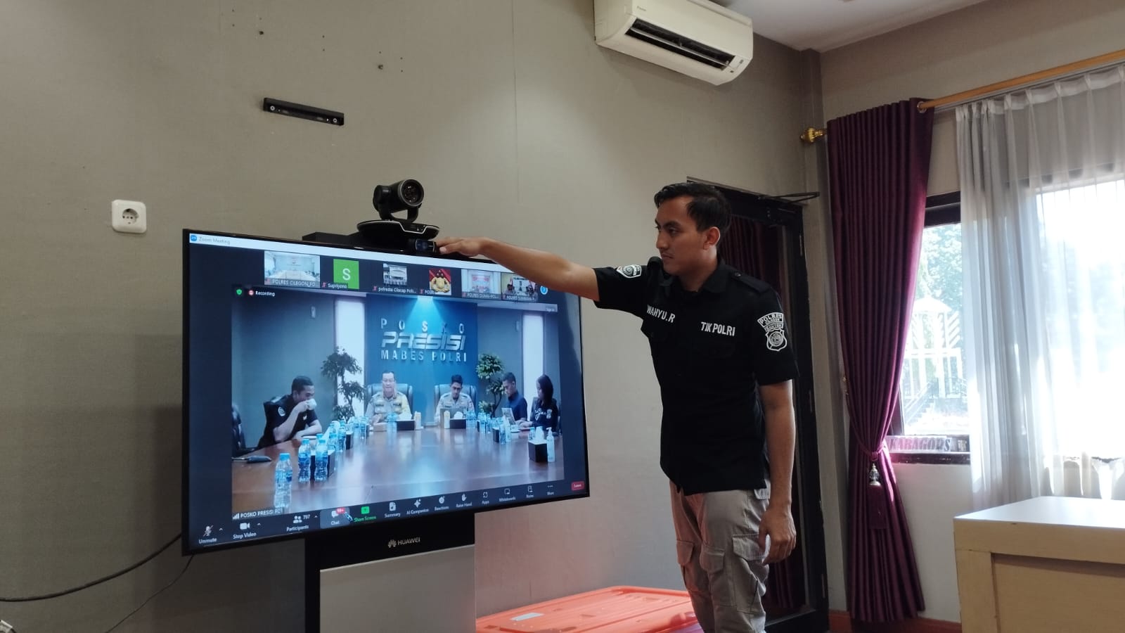 Anggota Tik Polres Cilegon Menyiapkan Sarana dan Prasarana Untuk Kegiatan Zoom meeting Dalam pelaksanaan kegiatan zoom meeting tersebut anggota TIK Polres Cilegon yang bertanggung jawab untuk menyiapkan peralatan zoom. Selain itu agar di tidak ada gangguan jaringan sebelum pelaksanaan anggota TIK melakukan pemeriksaan terhadap sarana dan prasarana tersebut . Satu jam sebelum kegiatan zoom meeting itu dimulai. Kapolres Cilegon AKBP. DR. MARTUA RAJA TARIPAR LAUT SILITONGA. melalui Kasi TIK IPTU Jajang Rohendi menyampaikan bahwa “untuk menunjang kelancaran penyampaian informasi anggota TIk Polres Cilegon selalu memeriksa sarana dan prasarana tersebut, sebelum maupun pada saat pelaksanaan akan selalu di monitor”