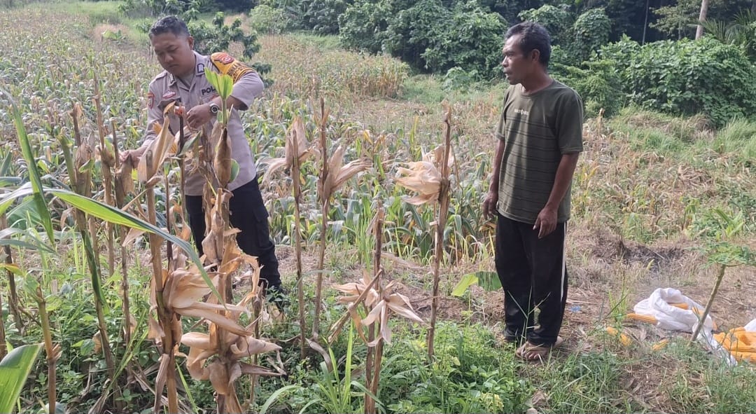Kapolsek, Kanit Binmas Dan Anggota Piket Polsek Mancak aktif dalam kegiatan monitoring panen jagung tanam secara mandiri yang di garap bapak Subrata.