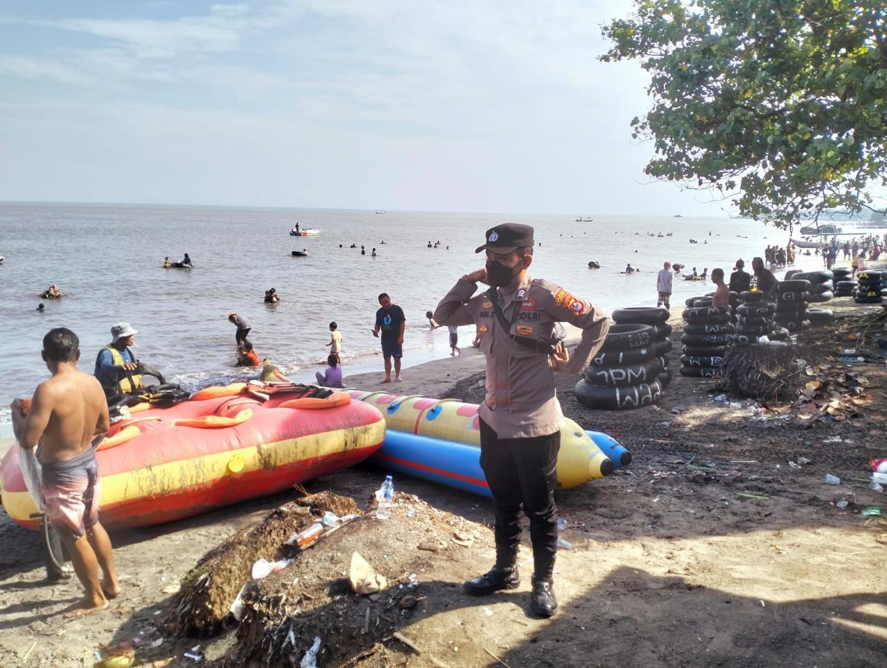 masyarakat yang sedang melaksankan pengamanan hari libur akhir pekan di pantai Pasir Putih