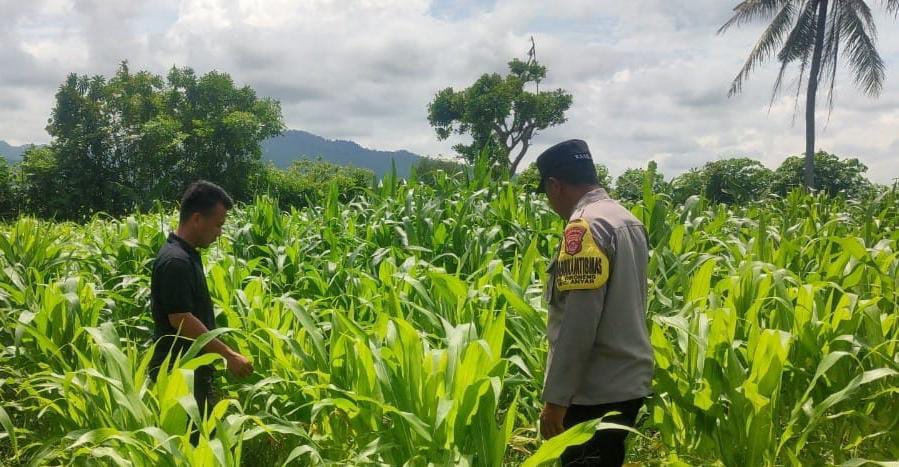 Dalam kegiatan monitoring ini, Bhabinkamtibmas meninjau langsung kondisi lahan jagung.